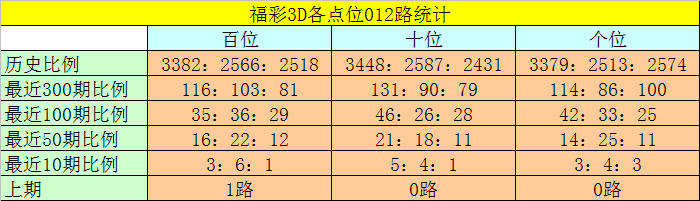 百位分析:该位最近10期开出了3个0路号码、6个1路号码、1个2路号码,1路号码热出,2路号码走冷。本期排除2路号码,参考号码:3。