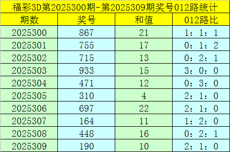 上期回顾:福彩3D第2025309期开出奖号:190。奖号为组六形态,与试机号有同号,奇偶比为2:1,大小比为1:2,012路比为2:1:0,和值为10,跨度为9。